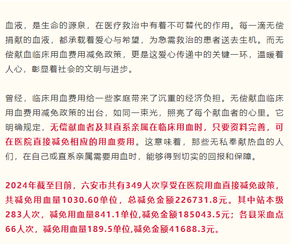 无偿献血,让爱无 “费”!今年六安已有349人次在医院享受用血直接减免政策