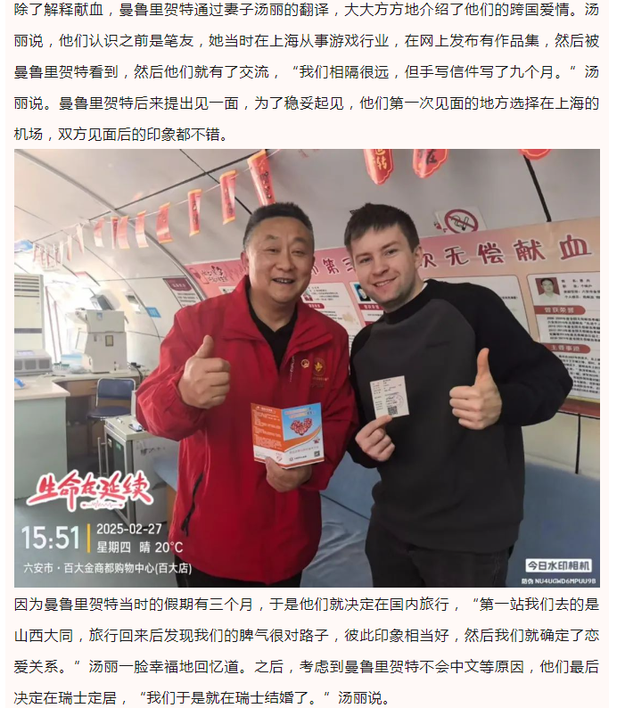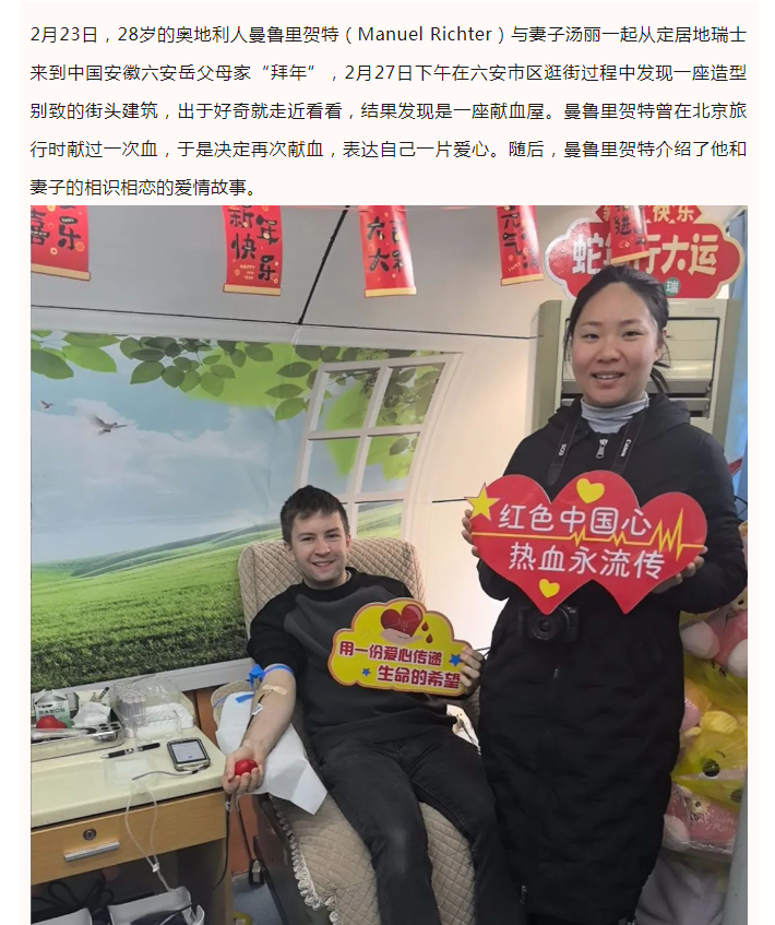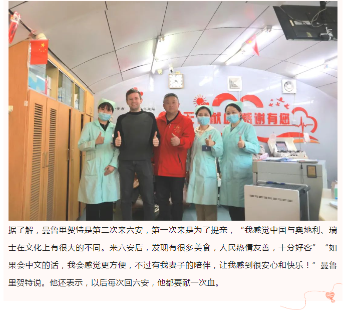 六安“洋”女婿主动献血400毫升,并称“以后每次回来都要献一次”