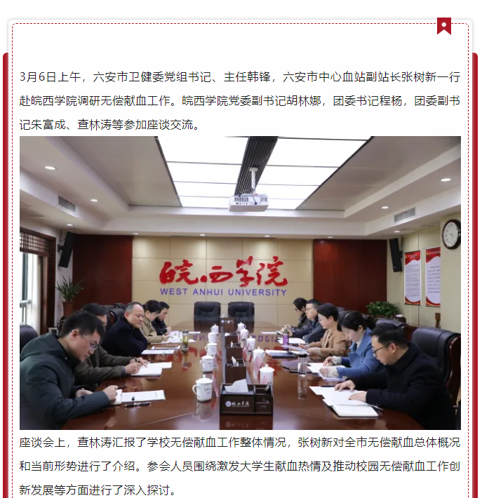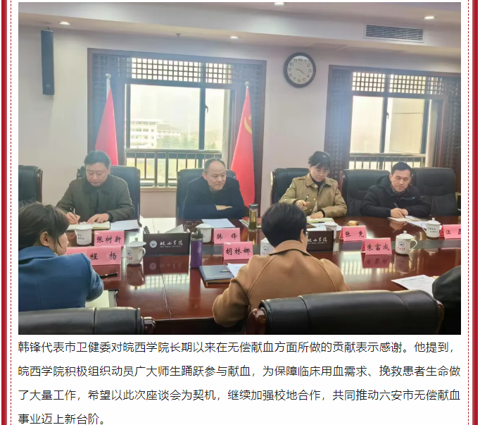 六安市卫健委党组书记、主任韩锋一行赴皖西学院调研无偿献血工作